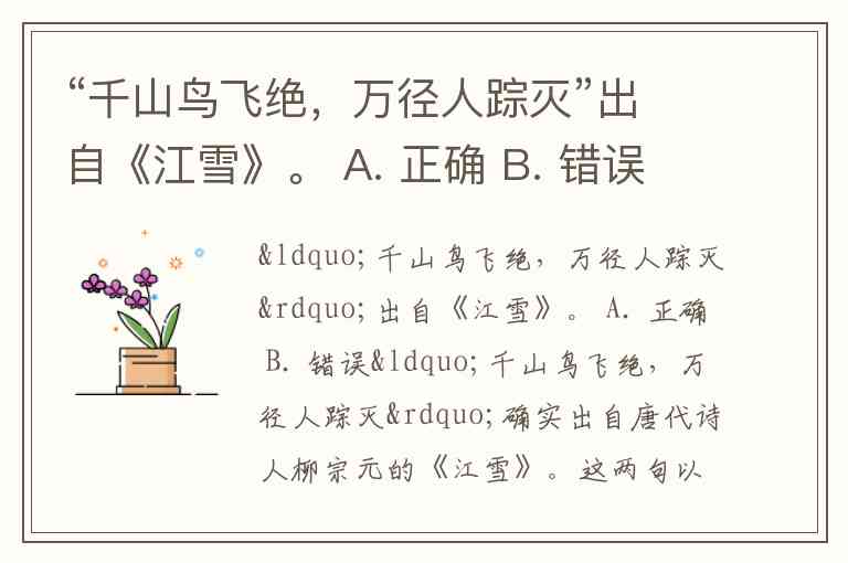 “千山鸟飞绝,万径人踪灭”出自《江雪》。 A. 正确 B. 错误