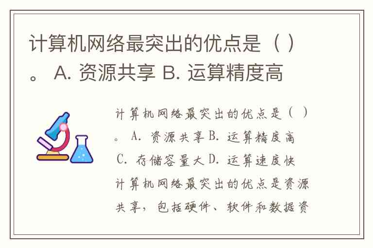 计算机网络最突出的优点是( )。 A. 资源共享 B. 运算精度高 C. 存储容量大 D. 运算速度快