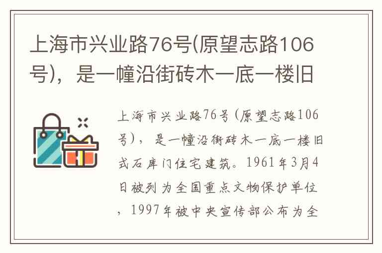 上海市兴业路76号(原望志路106号)是中国共产党第一次全国代表大会的召开地,被誉为中国共产党的“产床”。这栋典型的石库门建筑建于1920年秋,曾是中共一大代表李汉俊的住所,1921年7月23日,13位平均年龄28岁的代表在此召开会议,宣告了中国共产党的正式成立。