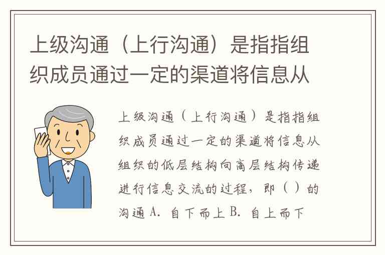 上级沟通(上行沟通)是指指组织成员通过一定的渠道将信息从组织的低层结构向高层结构传递进行信息交流的过程,即()的沟通 A. 自下而上 B. 自上而下 C. 层层 D. 越级