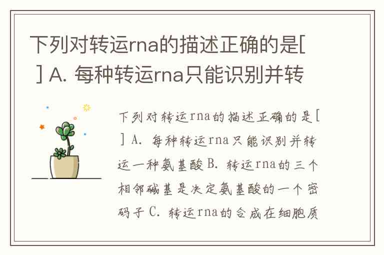 下列对转运rna的描述正确的是[ ] A. 每种转运rna只能识别并转运一种氨基酸 B. 转运rna的三个相邻碱基是决定氨基酸的一个密码子 C. 转运rna的合成在细胞质内 D. 转运rna能与dna相应的密码子互补