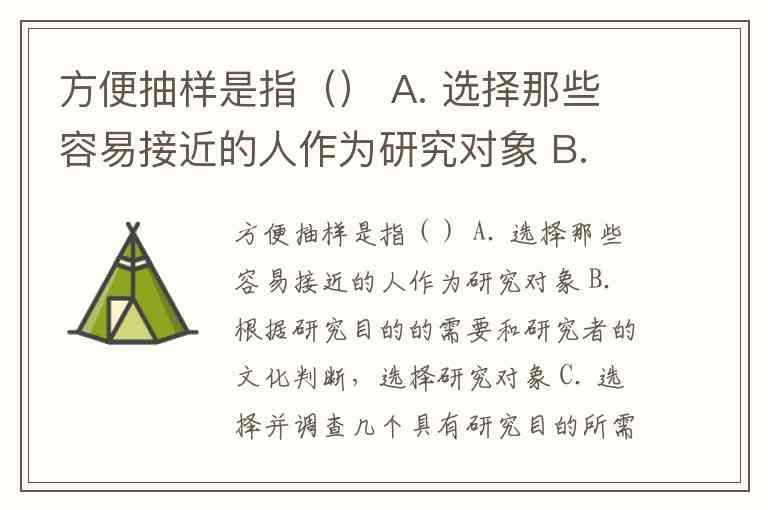 方便抽样是指() A. 选择那些容易接近的人作为研究对象 B. 根据研究目的的需要和研究者的文化判断,选择研究对象 C. 选择并调查几个具有研究目的所需特征的人,然后依靠他们再选择合乎研究需要的人 D. 先将要研究的人群按某种特征分成几个组别,然后按一定比例从每组中随机抽取一定量的样本作为研究对象 E. 将研究对象编号后,每间隔一定的号码抽取所需要的样本