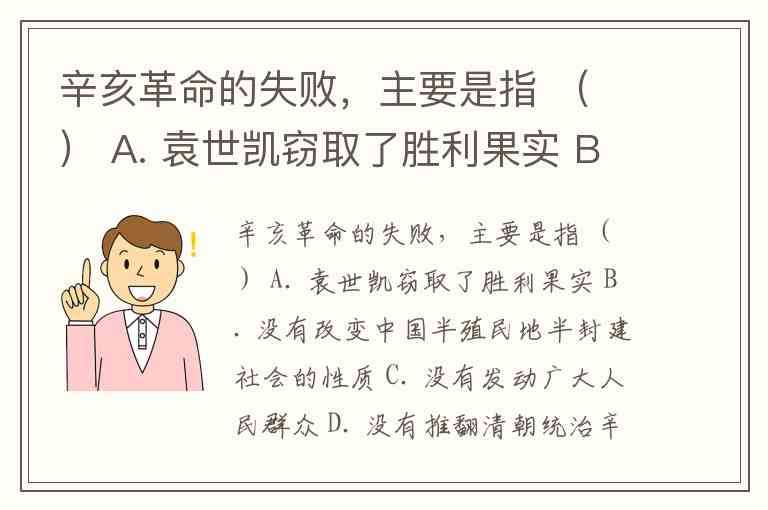辛亥革命的失败,主要是指 ( ) A. 袁世凯窃取了胜利果实 B. 没有改变中国半殖民地半封建社会的性质 C. 没有发动广大人民群众 D. 没有推翻清朝统治