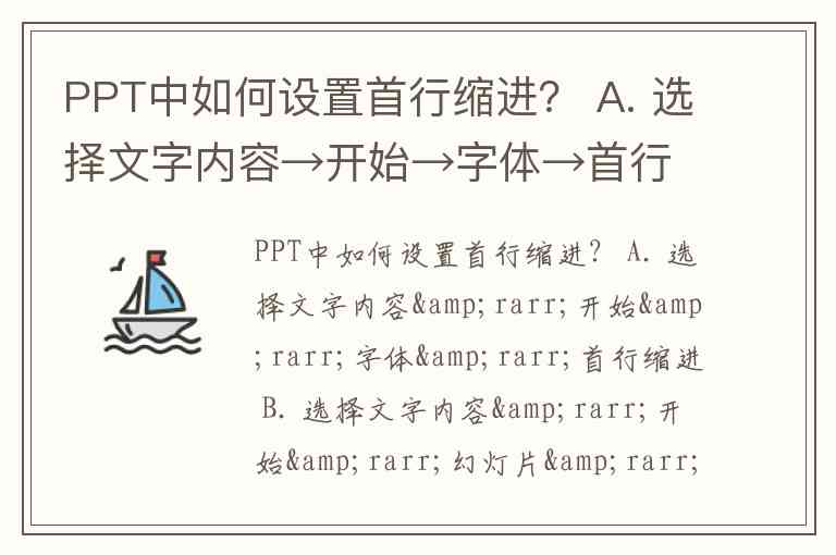PPT中如何设置首行缩进? A. 选择文字内容→开始→字体→首行缩进 B. 选择文字内容→开始→幻灯片→首行缩进 C. 选择文字内容→开始→段落→首行缩进 D. 选择文字内容→开始→剪贴板→首行缩进