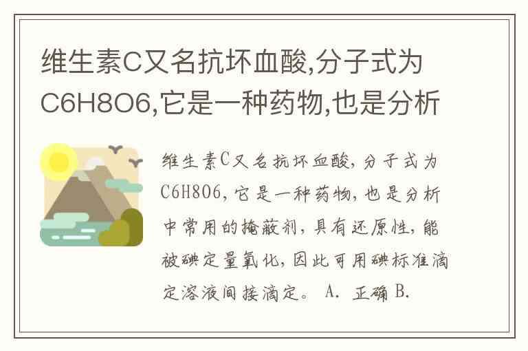 维生素C又名抗坏血酸,分子式为C6H8O6,它是一种药物,也是分析中常用的掩蔽剂,具有还原性,能被碘定量氧化,因此可用碘标准滴定溶液间接滴定。 A. 正确 B. 错误