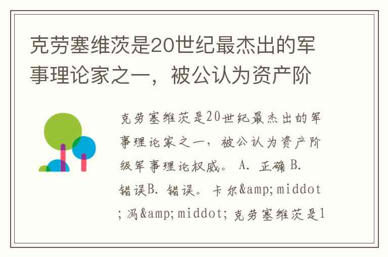 B. 错误。卡尔·冯·克劳塞维茨是19世纪的军事理论家,而非20世纪。根据史料记载,他生于1780年,卒于1831年,生活在法国大革命和拿破仑战争时期,其代表作《战争论》于1832年(即他去世后次年)首次出版。作为普鲁士军事改革派的核心人物,他的理论体系形成于19世纪初,深刻影响了近代军事思想,被公认为资产阶级军事理论的奠基人。题目中将其归为“20世纪”属于时间线误判,正确表述应为“19世纪最杰出的军事理论家之一”。