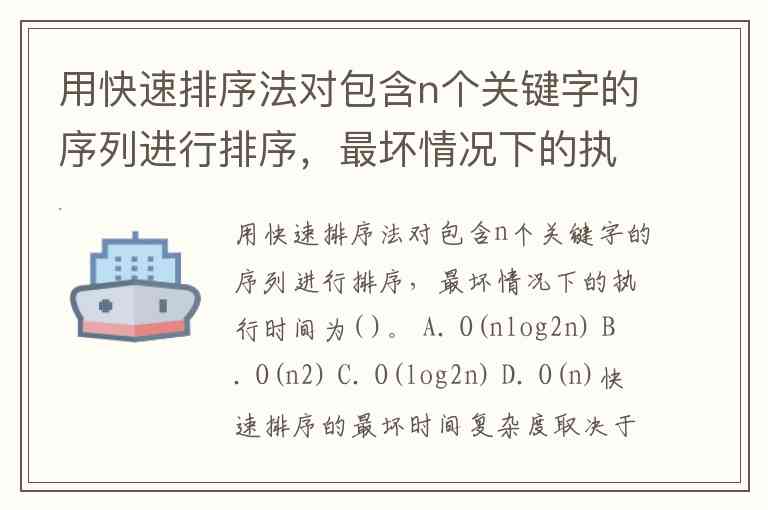 用快速排序法对包含n个关键字的序列进行排序,最坏情况下的执行时间为( )。 A. O(nlog2n) B. O(n2) C. O(log2n) D. O(n)