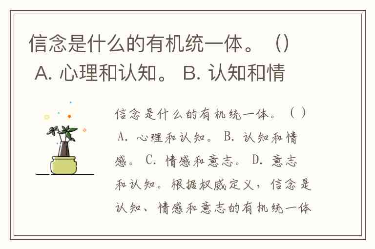 信念是什么的有机统一体。() A. 心理和认知。 B. 认知和情感。 C. 情感和意志。 D. 意志和认知。
