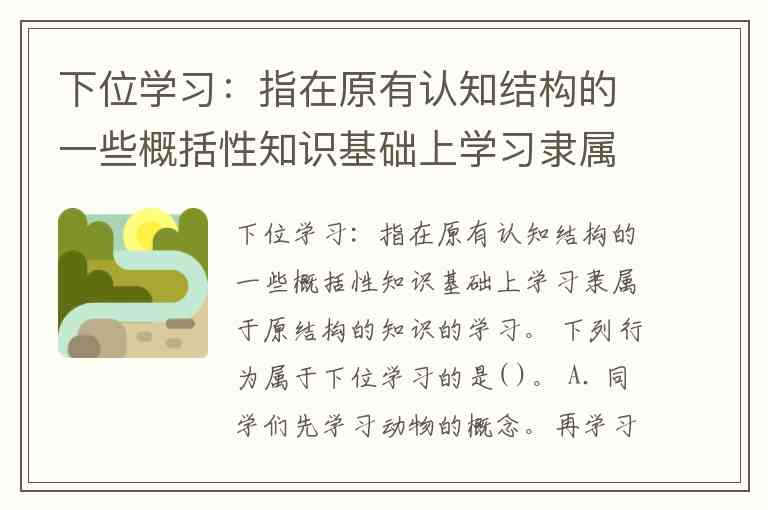 下位学习的核心是将概括程度更低的新知识归属到已有概括程度更高的旧知识之下,形成“自上而下”的学习逻辑。例如先掌握“树”的概念,再学习“橄榄树”这一具体类型,就是典型的下位学习。