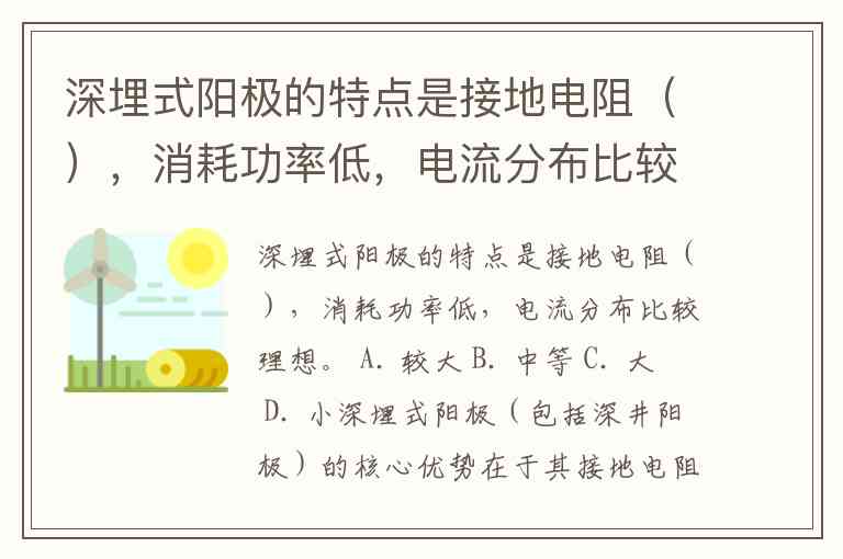 深埋式阳极的特点是接地电阻(),消耗功率低,电流分布比较理想。 A. 较大 B. 中等 C. 大 D. 小
