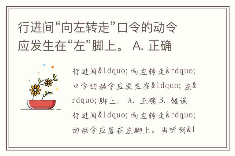 行进间“向左转走”口令的动令应发生在“左”脚上。 A. 正确 B. 错误