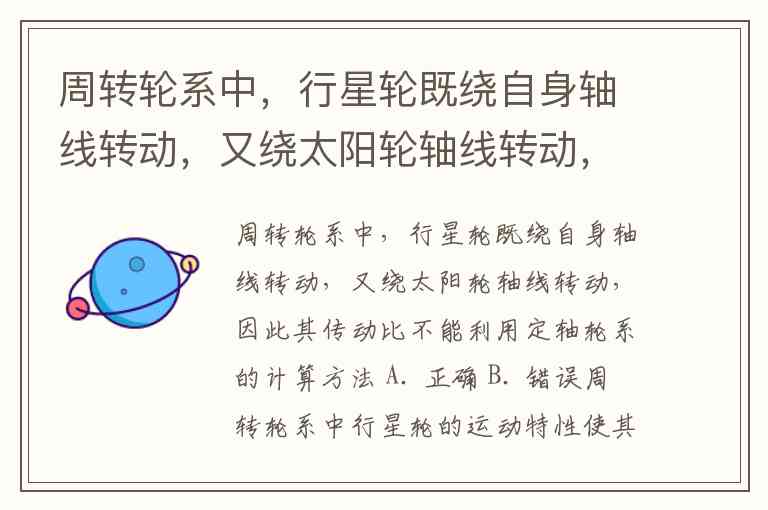 周转轮系中,行星轮既绕自身轴线转动,又绕太阳轮轴线转动,因此其传动比不能利用定轴轮系的计算方法 A. 正确 B. 错误
