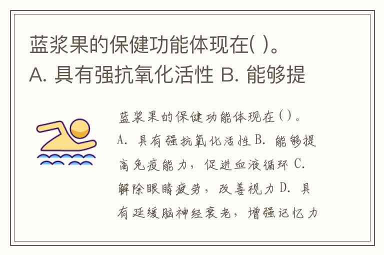蓝浆果的保健功能体现在( )。 A. 具有强抗氧化活性 B. 能够提高免疫能力,促进血液循环 C. 解除眼睛疲劳,改善视力 D. 具有延缓脑神经衰老,增强记忆力的作用