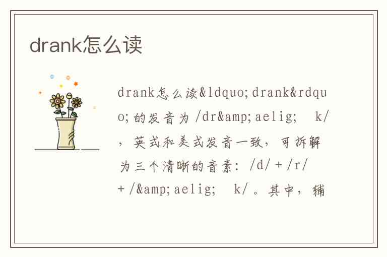 “drank”的发音为 /dræŋk/,英式和美式发音一致,可拆解为三个清晰的音素:/d/ + /r/ + /æŋk/ 。其中,辅音组合“dr”先发浊辅音/d/(类似“得”但短促),紧接着舌尖轻卷发/r/音;元音“æ”是核心,发音短促有力,类似汉语“爱”的起始口型;结尾“nk”发后鼻音/ŋk/,舌尖抵上齿龈,气流从鼻腔泄出后迅速过渡到/k/音 。