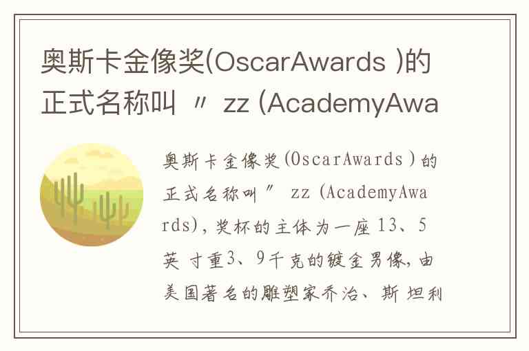 奥斯卡金像奖(OscarAwards )的正式名称叫 〃 zz (AcademyAwards),奖杯的主体为一座 13、5 英 寸重3、9千克的镀金男像,由美国著名的雕塑家乔治、斯 坦利设计。 A. 电影艺术与科学学院奖 B. 科学艺术与电影百花奖 C. 科学艺术院奖