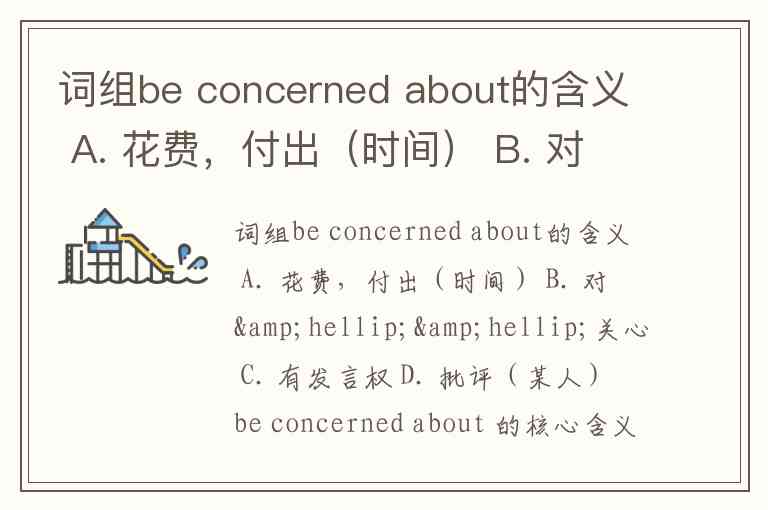 词组be concerned about的含义 A. 花费,付出(时间) B. 对……关心 C. 有发言权 D. 批评(某人)