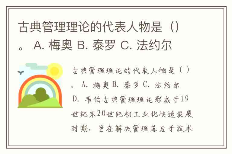 古典管理理论的代表人物是()。 A. 梅奥 B. 泰罗 C. 法约尔 D. 韦伯