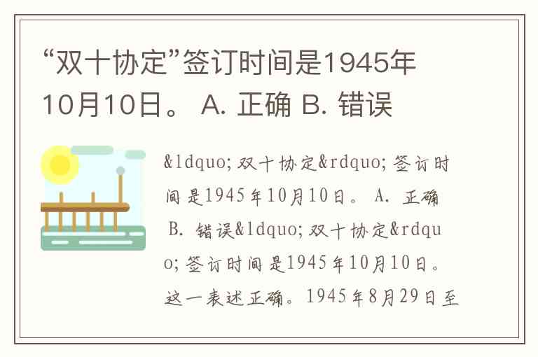 “双十协定”签订时间是1945年10月10日。 A. 正确 B. 错误
