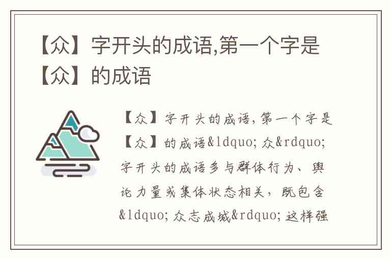 “众”字开头的成语多与群体行为、舆论力量或集体状态相关,既包含“众志成城”这样强调团结力量的积极表达,也有“众叛亲离”这类描述孤立困境的警示性词汇。以下是常见且实用的“众”字成语分类及解析: