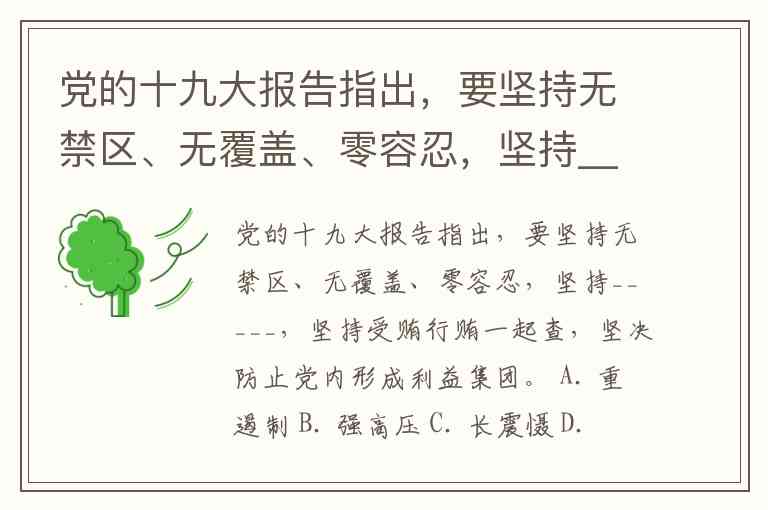 党的十九大报告指出,要坚持无禁区、无覆盖、零容忍,坚持_____,坚持受贿行贿一起查,坚决防止党内形成利益集团。 A. 重遏制 B. 强高压 C. 长震慑 D. 不减压