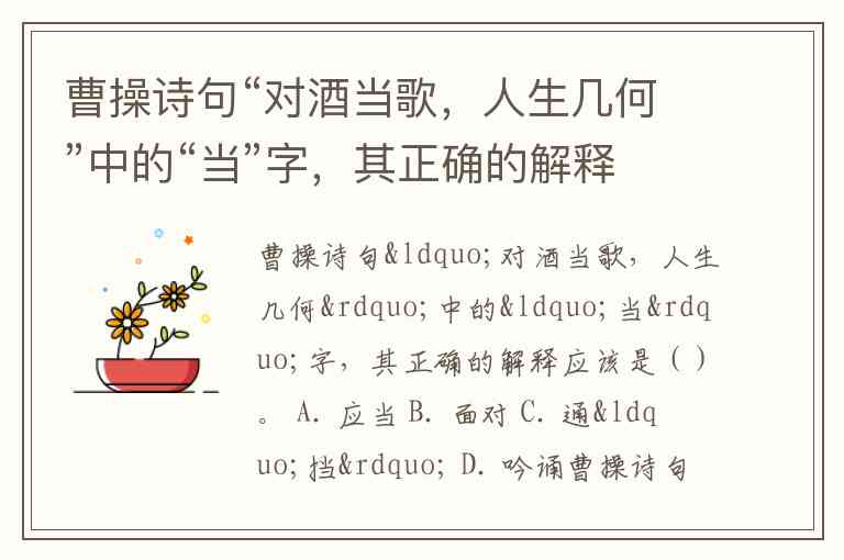 曹操诗句“对酒当歌,人生几何”中的“当”字,其正确的解释应该是()。 A. 应当 B. 面对 C. 通“挡” D. 吟诵