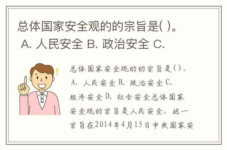 总体国家安全观的的宗旨是( )。 A. 人民安全 B. 政治安全 C. 经济安全 D. 社会安全
