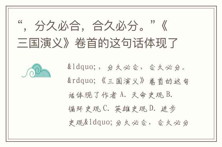 “,分久必合,合久必分。”《三国演义》卷首的这句话体现了作者 A. 天命史观 B. 循环史观 C. 英雄史观 D. 进步史观