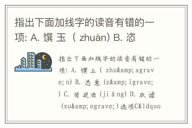 指出下面加线字的读音有错的一项: A. 馔 玉( zhuàn) B. 恣 意 (zì) C. 将 进酒 (jiāng) D. 欢 谑 (xuè)