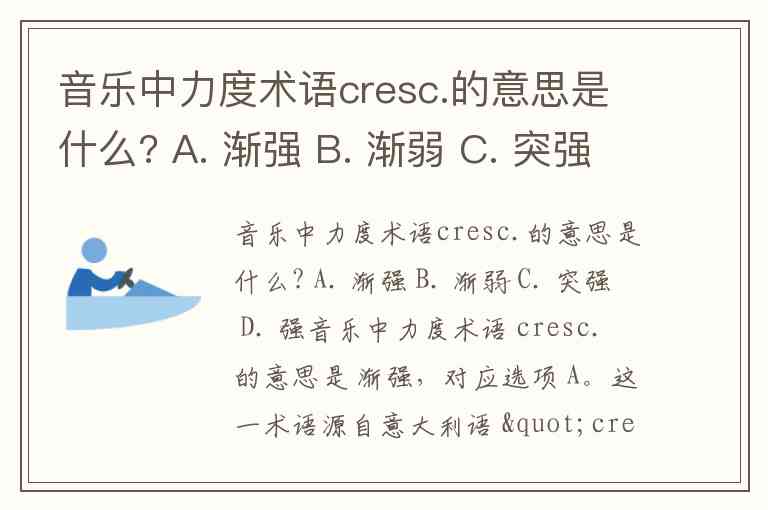 音乐中力度术语 cresc. 的意思是 渐强,对应选项 A。这一术语源自意大利语 "crescendo",在乐谱中表示演奏或演唱时音量应逐渐增强,是音乐表现中控制动态变化的核心术语之一。