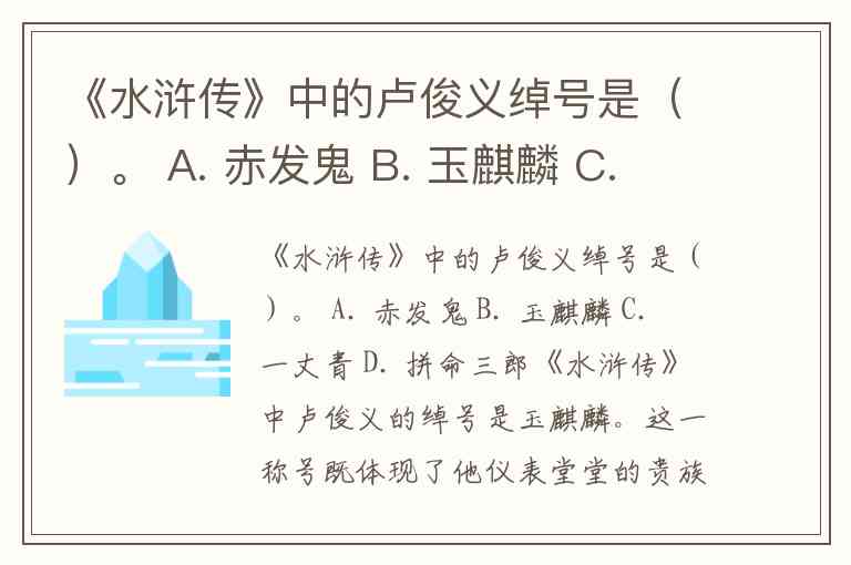 《水浒传》中的卢俊义绰号是()。 A. 赤发鬼 B. 玉麒麟 C. 一丈青 D. 拼命三郎