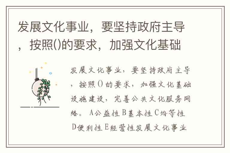 发展文化事业,要坚持政府主导,按照()的要求,加强文化基础设施建设,完善公共文化服务网络。 A公益性 B基本性 C均等性 D便利性 E经营性