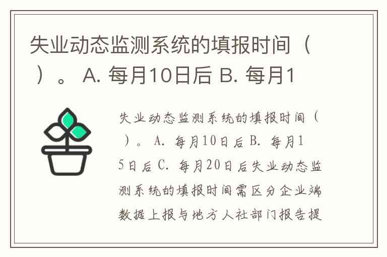 失业动态监测系统的填报时间( )。 A. 每月10日后 B. 每月15日后 C. 每月20日后
