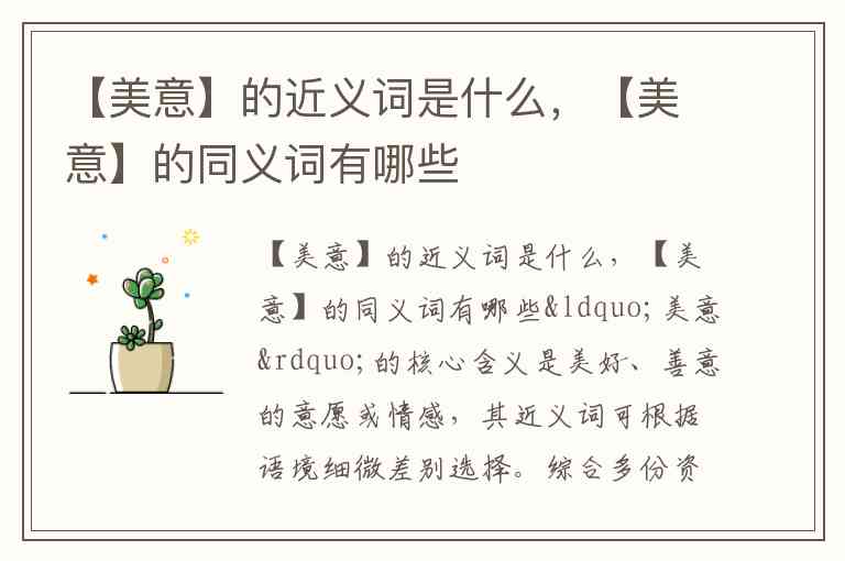 “美意”的核心含义是美好、善意的意愿或情感,其近义词可根据语境细微差别选择。综合多份资料,最常用的近义词包括好心、好意、善意、盛情、盛意,这些词汇在各来源中均有高频出现。