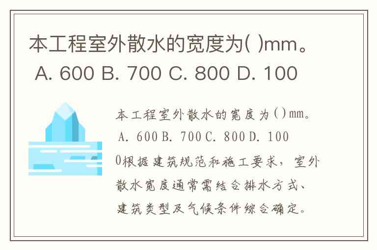 本工程室外散水的宽度为( )mm。 A. 600 B. 700 C. 800 D. 1000