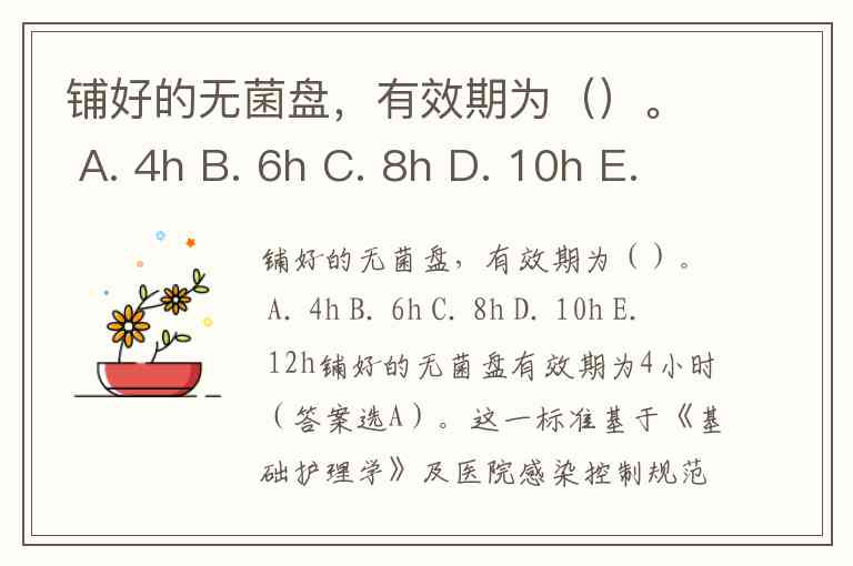 铺好的无菌盘有效期为4小时(答案选A)。这一标准基于《基础护理学》及医院感染控制规范,通过科学验证微生物污染风险得出——在常规医疗环境中,4小时内可保持足够的无菌状态,超过此时限则需重新灭菌处理。