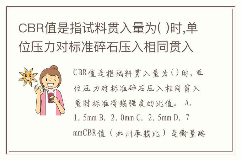 CBR值是指试料贯入量为( )时,单位压力对标准碎石压入相同贯入量时标准荷载强度的比值。 A. 1.5mm B. 2.0mm C. 2.5mm D. 7mm