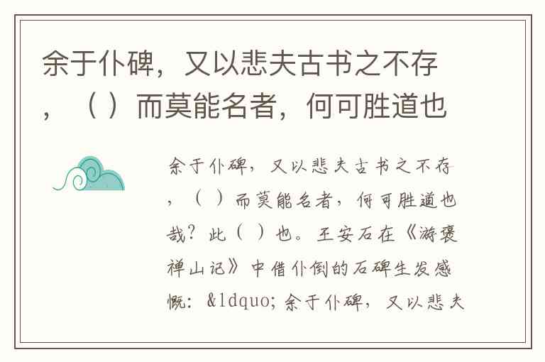 王安石在《游褒禅山记》中借仆倒的石碑生发感慨:“余于仆碑,又以悲夫古书之不存,后世之谬其传而莫能名者,何可胜道也哉?此所以学者不可以不深思而慎取之也。” 这两空分别填入“后世之谬其传”和“所以学者不可以不深思而慎取之也”,体现了作者对文献讹误的痛心与治学态度的警示。