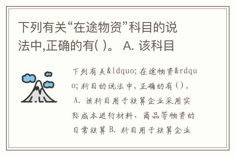 A 正确:该科目专门用于实际成本法下的日常核算,涵盖材料、商品等物资在价款已付但尚未验收入库阶段的成本追踪。例如,企业支付钢材货款后,货物仍在运输途中时,需通过“在途物资”核算其采购成本。