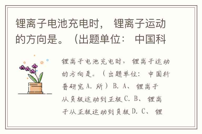 锂离子电池充电时, 锂离子运动的方向是。(出题单位: 中国科普研究 A. 所) B. A、 锂离子从负极运动到正极 C. B、 锂离子从正极运动到负极 D. C、 锂离子在正负两极来回运动 E. D、 锂离子无规则运动