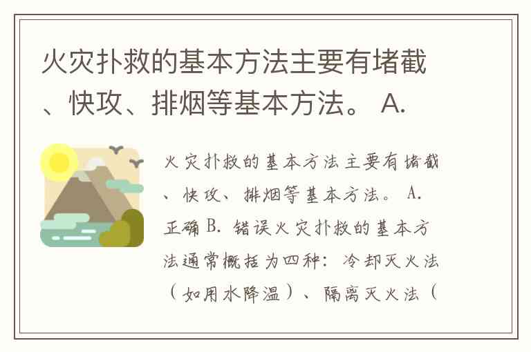 火灾扑救的基本方法主要有堵截、快攻、排烟等基本方法。 A. 正确 B. 错误