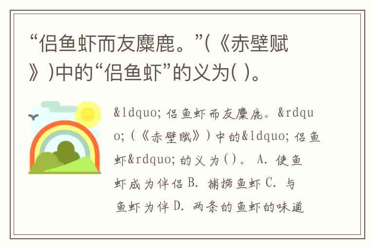 “侣鱼虾而友麋鹿。”(《赤壁赋》)中的“侣鱼虾”的义为( )。 A. 使鱼虾成为伴侣 B. 捕捞鱼虾 C. 与鱼虾为伴 D. 两条的鱼虾的味道美