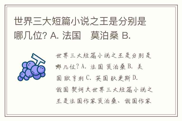 世界三大短篇小说之王是分别是哪几位? A. 法国 莫泊桑 B. 美国 欧亨利 C. 英国 狄更斯 D. 俄国 契诃夫