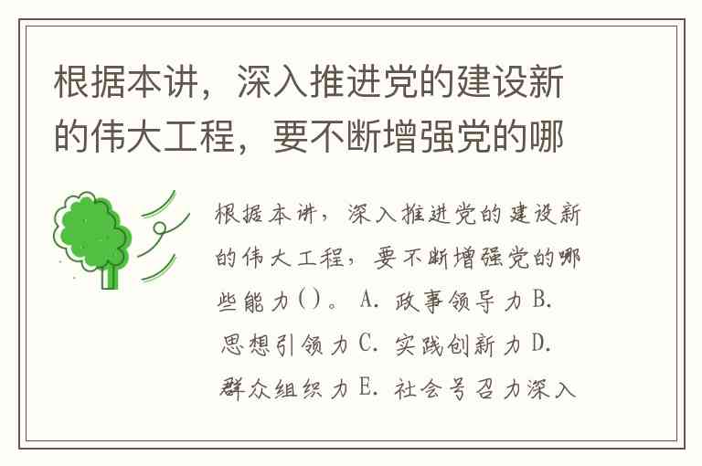 根据本讲,深入推进党的建设新的伟大工程,要不断增强党的哪些能力( )。 A. 政事领导力 B. 思想引领力 C. 实践创新力 D. 群众组织力 E. 社会号召力