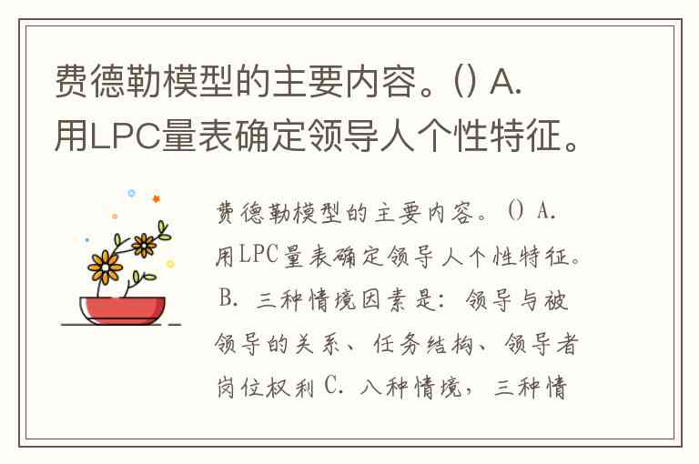 费德勒模型的主要内容。() A. 用LPC量表确定领导人个性特征。 B. 三种情境因素是:领导与被领导的关系、任务结构、领导者岗位权利 C. 八种情境,三种情况; D. 最有利和最不利的两种情境中,采用以任务为中心的领导方式; E. 中等状态的情境中,采用以关系为领导者中心领导方式效果较好。