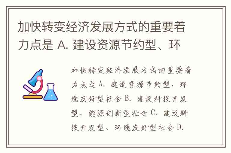 加快转变经济发展方式的重要着力点是 A. 建设资源节约型、环境友好型社会 B. 建设科技开发型、能源创新型社会 C. 建设科技开发型、环境友好型社会 D. 建设资源节约型、能源创新型社会