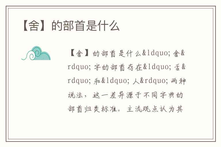 “舍”字的部首存在“舌”和“人”两种说法,这一差异源于不同字典的部首归类标准。主流观点认为其部首为“舌”,如《新华字典》及多个汉字解释页面均明确标注“部首:舌”,且该字为上下结构,上半部分“人”与下半部分“舌”组合,从字形分析“舌”作为核心构字部件更符合部首划分逻辑。