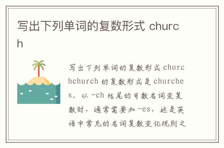 church 的复数形式是 churches。以 -ch 结尾的可数名词变复数时,通常需要加 -es,这是英语中常见的名词复数变化规则之一,类似的例子还有 watch → watches、match → matches 等。