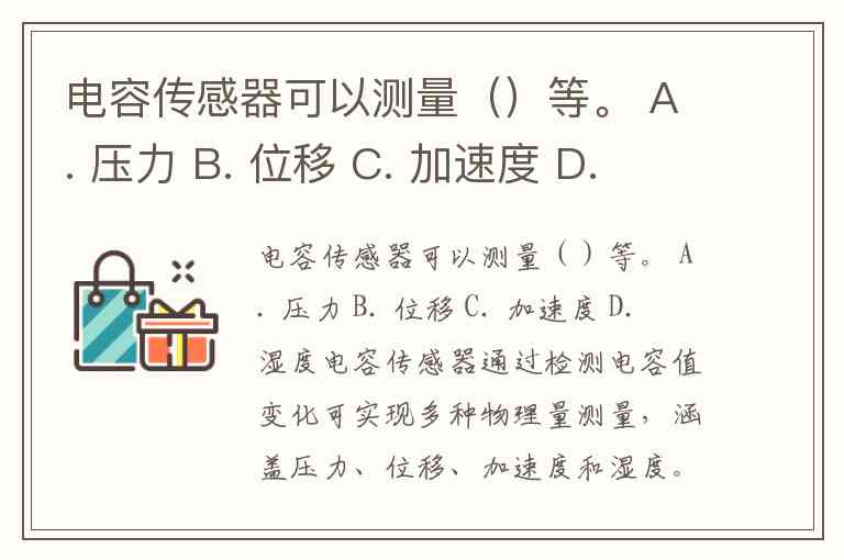 电容传感器可以测量()等。 A. 压力 B. 位移 C. 加速度 D. 湿度