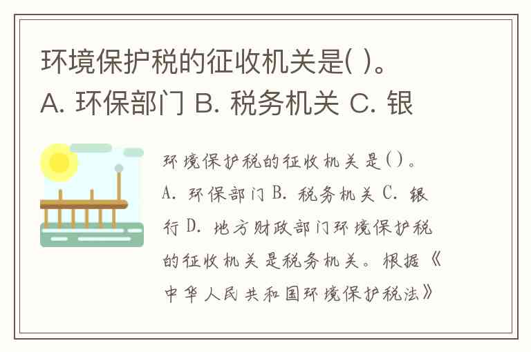 环境保护税的征收机关是( )。 A. 环保部门 B. 税务机关 C. 银行 D. 地方财政部门