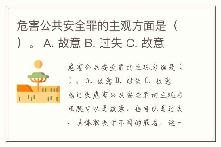 危害公共安全罪的主观方面是()。 A. 故意 B. 过失 C. 故意或过失